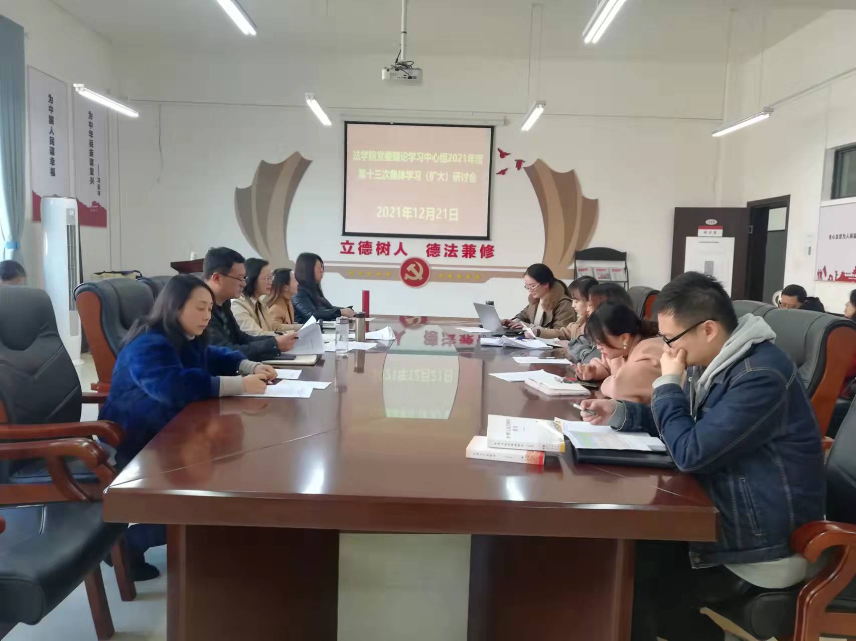 (法学院 图文/报道 母桂花)2021年12月21日,法学院党委理论学习中心组在文德楼A8-310会议室围绕“中国共产党第十九届中央委员会第六次全体会议和中国共产党贵州省第十二届委员会第十次全体会议精神”专题集中学习研讨。学院领导及全体行政人员、支部书记参加会议。学院党委书记詹伟主持会议。