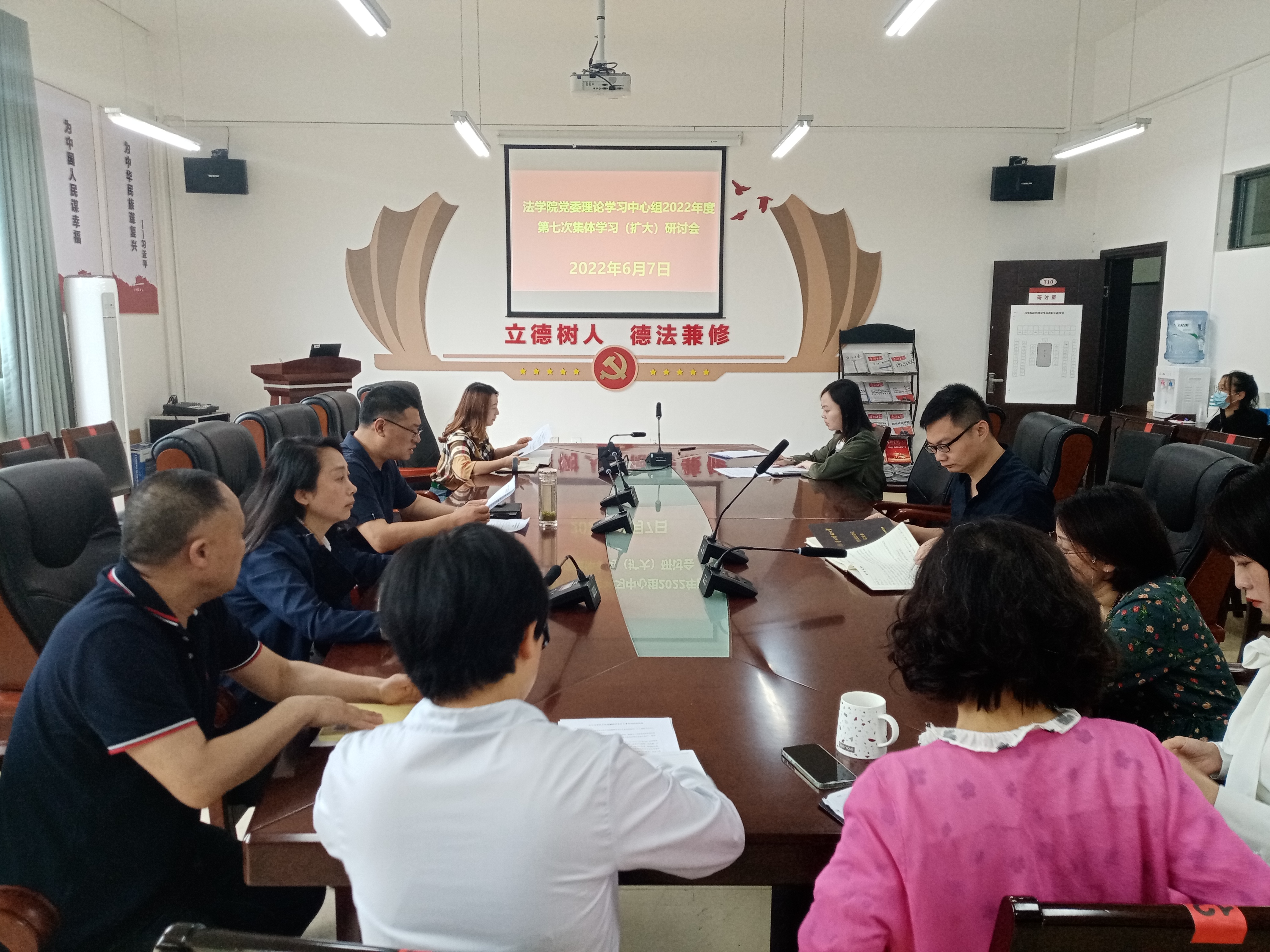 (法学院 图文/报道 徐方)2022年6月7日上午,法学院党委理论学习中心组在文德楼A8-310会议室围绕“庆祝中国共产主义青年团成立100周年大会精神”专题集中学习研讨。学院领导及全体行政人员、党支部书记参加会议。学院党委书记詹伟主持会议。