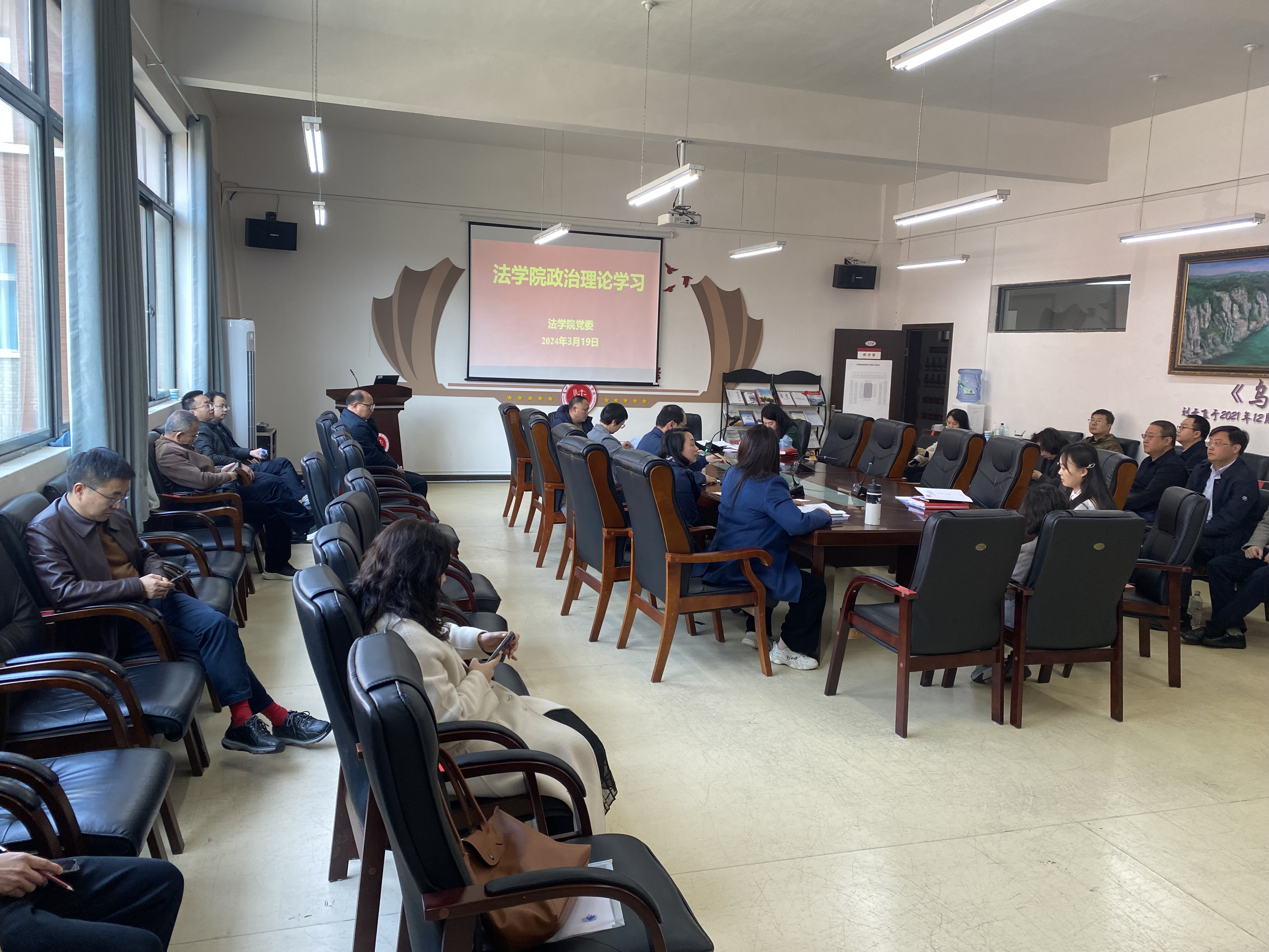 (法学院 莫丹洵 报道|摄影 )3月19日,法学院党委组织召开2024年度第二次教职工政治理论集体学习全国两会及全省两会专题研讨会。院领导及全院教职工出席会议,院党委副书记、院长陈玉梅主持会议。