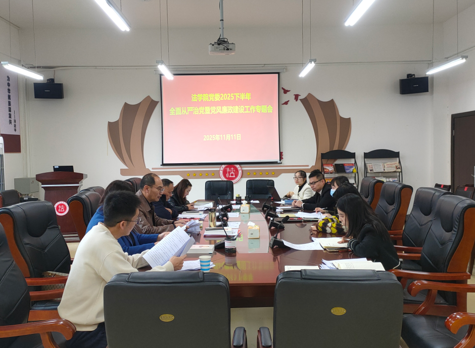 11月11日,法学院全面从严治党暨党风廉政建设专题党委会在西区文德楼310会议室召开。党委书记邵新顺主持会议并讲话,院党委班子成员,各科室负责人、各系部及中心负责人、党支部书记、纪委委员参加会议。