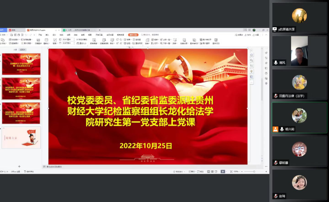 (法学院 杨兴莉报道|摄影 鄢铭蕙)10月25日下午,校党委委员、省纪委省监委派驻贵州财经大学纪检监察组组长龙化在参加十三届贵州省委第一轮巡视期间,通过腾讯会议为法学院研究生第一党支部、纪检监察党支部、国合处党支部上党课,党课主题为党史学习教育和党的二十大精神宣讲。