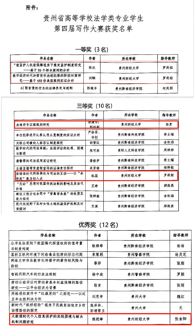 贵州省高等学校法学类专业学生写作大赛由贵州省高等学校法学类教学指导委员会主办,是展现法学类学生学术素养、学术能力的重要赛事。截至目前,大赛已成功举办第四届,有力推动了我省法学类教学创新理念和专业人才培养。