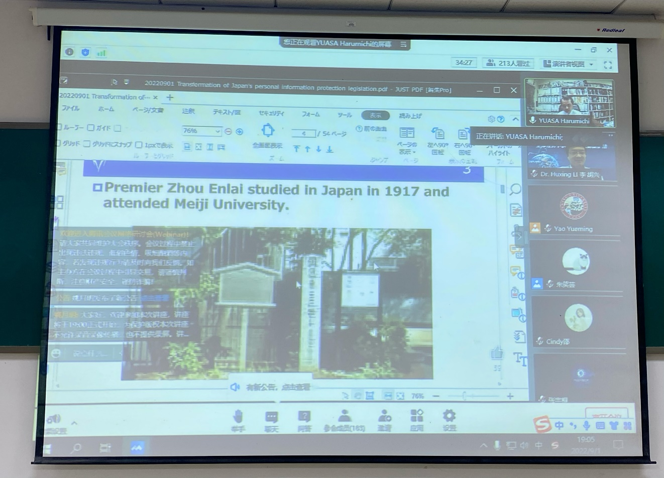 (法学院 图文/报道 杨洁芮)为促进数字法治国际交流合作,提升数字经济司法治理水平,2022年9月1日晚19点,法学院组织在校研究生200余人在乐学楼1-1在线观看了由北京大学法学院组织的“数字与法治”系列论坛。本次论坛由中国学者和日本、欧洲、美国的知名学者共同探讨“全球视野下的隐私与数据保护法”这一核心主题。此次专题为“日本个人信息保护立法的转变”,由日本明治大学全球治理研究科教授汤浅垦道(Yuasa Harumichi)作为开讲学者。