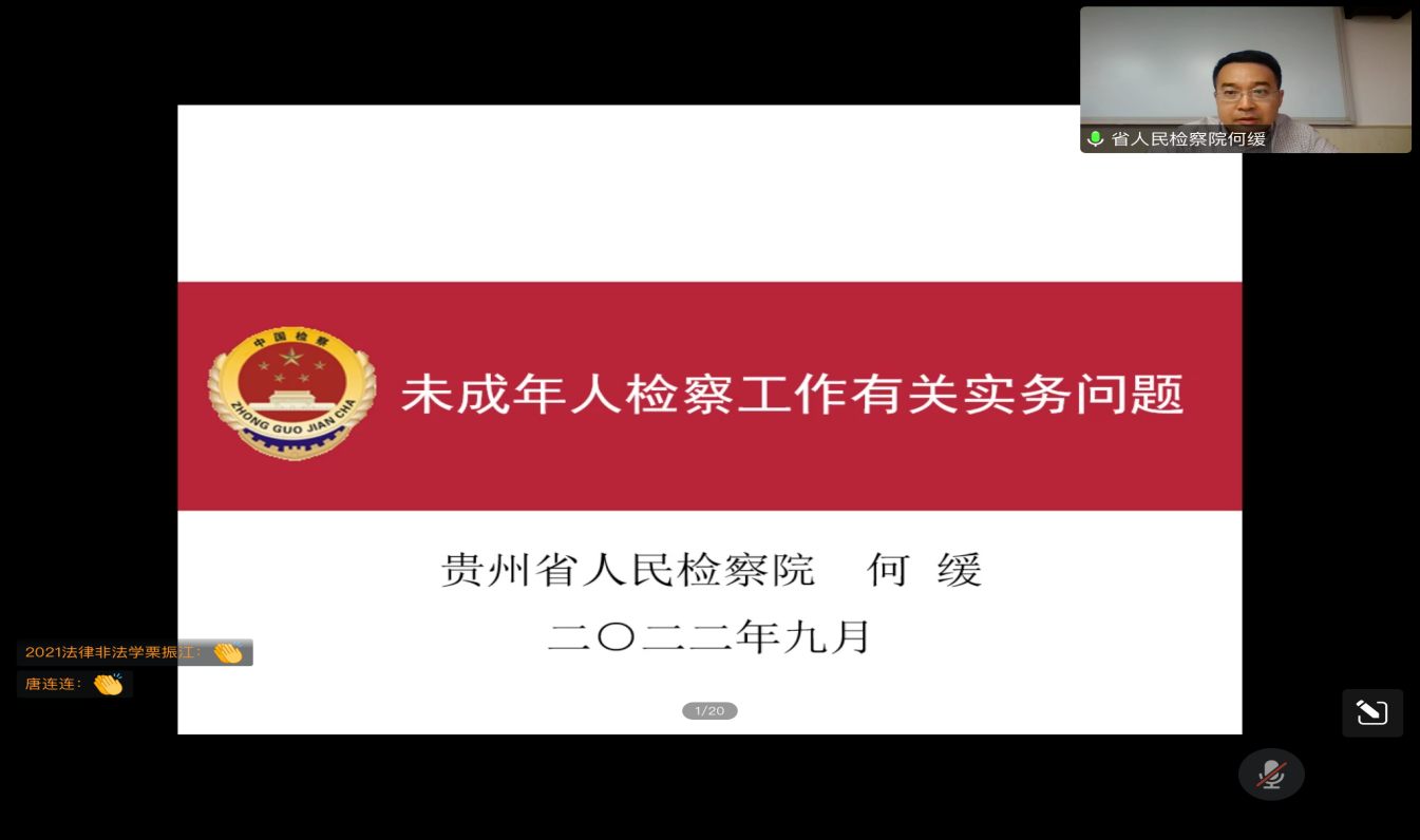 (法学院 图文/报道 钟佳昕)9月30日下午,由法学院承办的“未成年人检察工作有关实务问题”讲座通过腾讯会议举行。本次讲座由贵州省人民检察院第一检察部副主任、四级高级检察官何缓主讲。华体会线上平台(集团)官方网站党委委员、副教授宋昭澜主持会议。法学院本科生、研究生及会计、工商管理等专业学生300余人次线上聆听。