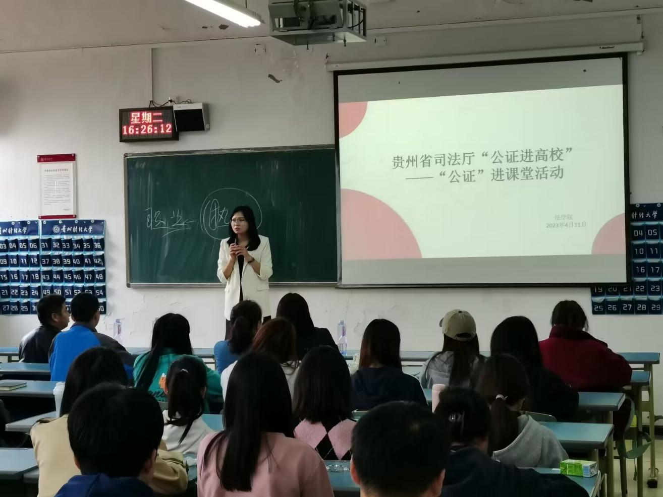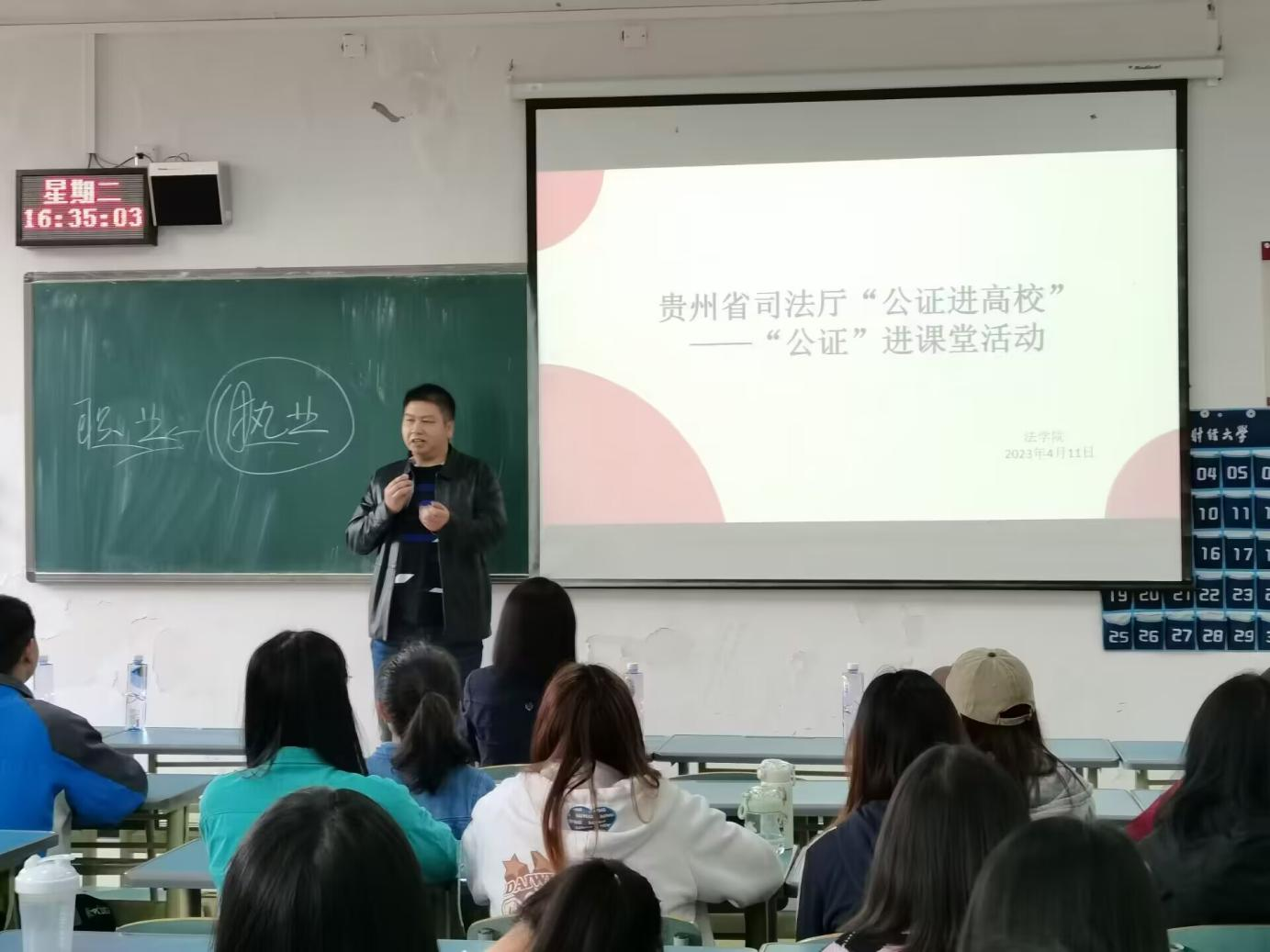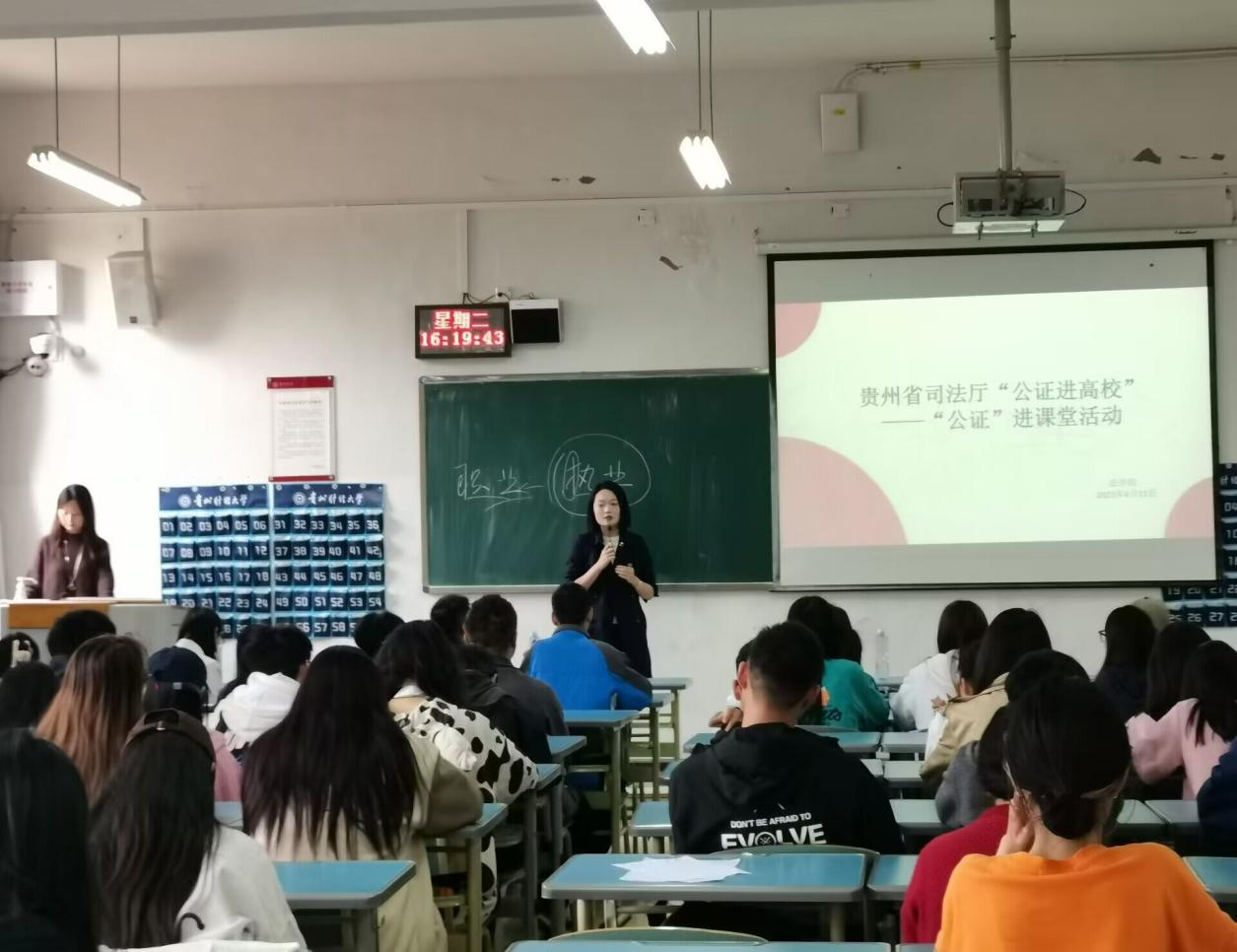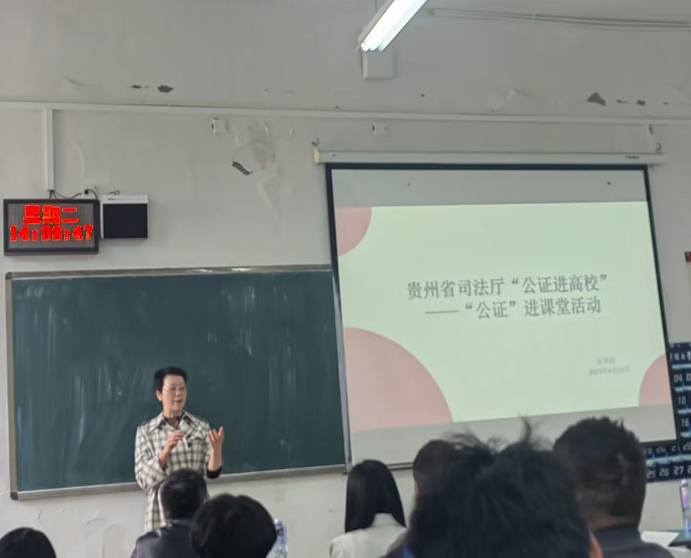 (法学院 图文/报道 张显薇)2023年4月11日下午两点,华体会线上平台(集团)官方网站120名学生在博学楼2-19教室参加了贵州省司法厅“公证进高校”活动。贵州省司法厅公共法律服务管理处三级调研员申状平,贵阳市公证协会第三届理事会副会长兼秘书长龚燕婕,凤冈县公证处执业公证员、我院2013级法学专业优秀校友王克桃参与此次活动,法学院党委副书记、院长陈玉梅主持。