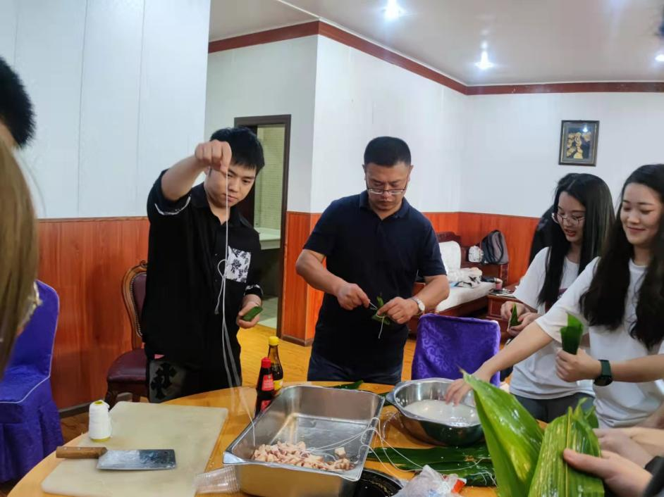 活动中,领导、老师及食堂工作人员手把手现场教学,带领参与活动的同学们一步步制作。大家分工协作,有的清洗粽叶,有的裁剪棉线,有的淘米,有的切肉,有的包粽。参加活动的同学们时而互相“取经”,时而互换“工种”,一小时后,一个个亲手制作的精美的粽子“出炉”待煮。虽然是第一次制作,但是大家都做的有模有样的,看着各自亲手制作的粽子,欣喜感油然而生。