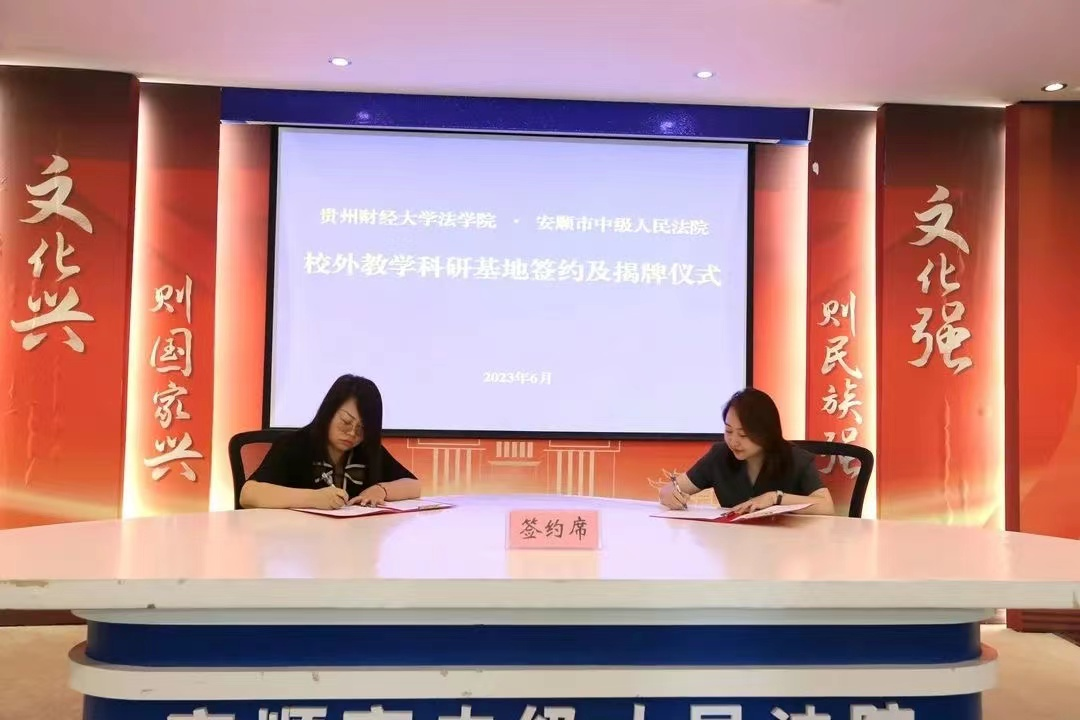 (法学院 图文/报道 顾茜茜)6月16日,法学院与安顺市中级人民法院校外教学科研基地签约及揭牌仪式暨调研座谈会在安顺中院举行。法学院党委副书记、院长陈玉梅,党委副书记彭华,副院长宋昭澜,安顺市中级人民法院副院长陈惠英、贾梦嫣和相关部门负责同志,法学院在安顺中院实习生等参加活动。
