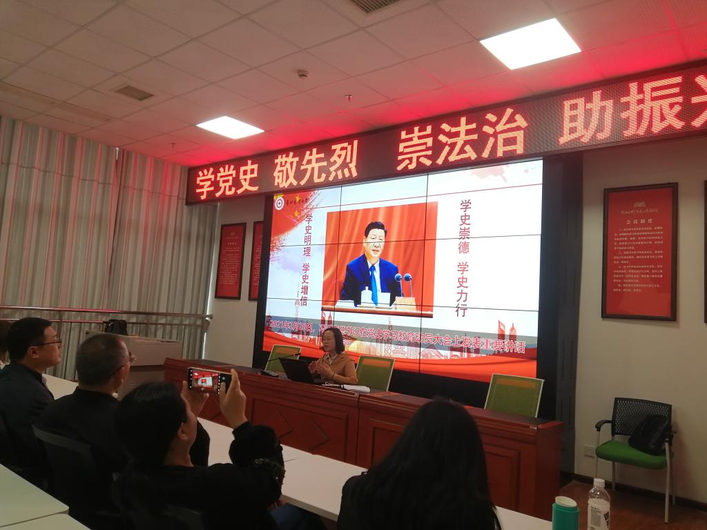 陈玉梅从新民主主义革命、社会主义革命、社会主义现代化建设以及中国特色社会主义新时代四个历史时期带领全体教职工回顾了百年党史,从五个方面的发展成就总结了党在百年奋斗中做出的伟大贡献,然后将“九个始终坚持”与具体事例相结合讲述了党在革命、建设、改革中的宝贵经验。陈玉梅还讲述了法学院法学学科建设过程的不易,尤其是法学一级硕士学位授权点的获得是法学几代人奋斗的结果。